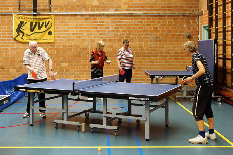 Normaal gesproken is de zaal van tafeltennisvereniging VVV op vrijdagochtend en –middag het decor voor het Fifty+ViTT-programma. Op vrijdag 6 april, World Table Tennis Day, was er echter een speciale editie van dit succesvolle vitaliteitsprogramma voor 50+’ers. De zaal was namelijk omgebouwd tot ‘speelterrein’: er kon nog steeds getafeltennist worden, maar dan wel nét even anders. Zo stond er bijvoorbeeld een tafel die twee keer zo lang was als gebruikelijk, er was een tafel waarop boter-kaas-en-eieren kon worden gespeeld en er waren twee tafeltennistafels in een vierkant geplaatst, waardoor er vier spelers tegelijk konden spelen, allemaal achter hun eigen helft.